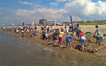 Participation in the Battle of the beach challenge starts with a guest lecture at the primary school by a water expert of the local water authority. On the day of the event the school teams are given marked plots on the beach and they have one hour to build their sand castles with a flag on top. Then the tides comes in, destroying all sand castles. The one with the last remaining flag is the winner.