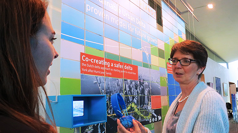 The result is a striking large wall display decorating the forum area with typical Dutch solutions to climate change, such as building with nature and co-creating a safer delta.