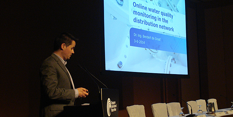 Bendert de Graaf of Vitens Solutions shared the preliminary results of a real time monitoring project of a drinking water distribution system in Leeuwarden, the Netherlands. For this project 45 EventLab sensors are used, developed by the Dutch-Singapore company Optiqua. De Graaf told of two incidents that were immediately detected. One was a major pipe burst and the other a malfunction of the water softening process. In both cases the real-time EventLab sensors measured a sudden change of water quality and alarmed the operator in the control room who could take subsequent action.
